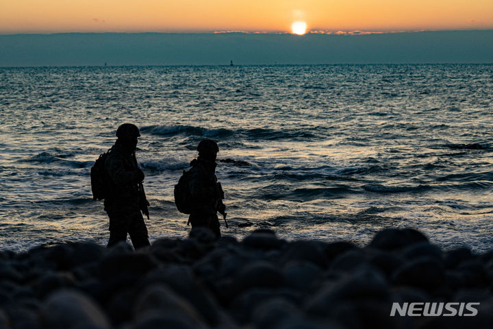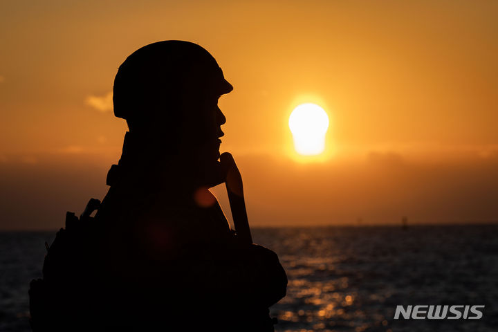 인천 옹진군 대연평도에서 해병대원들이 지는해를 뒤로 하고 수색정찰을 하고 있다.