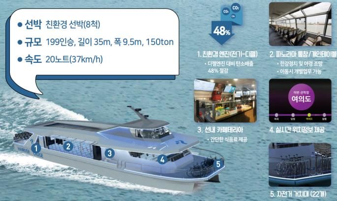 시는 디젤엔진보다 이산화탄소를 약 48% 적게 배출하는 친환경 하이브리드 선박 8대로 운항을 시작한 뒤 점차 확대할 계획이다. 선박 가격은 대당 43억원 수준이다.