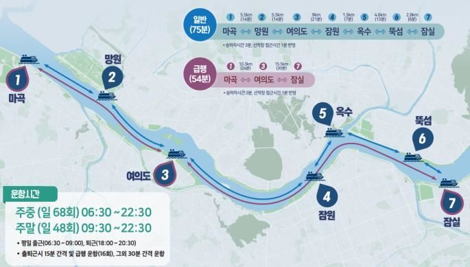 마곡·여의도·잠실 선착장 3곳만 정차하는 급행노선은 출퇴근 시간대에 16회 운항한다. 마곡에서 잠실까지 일반노선 이용 시 75분이 소요된다면, 급행노선은 21분이 단축된 54분 만에 이동 가능해 출·퇴근 시간대 효율적인 이동을 도울 것으로 기대된다.