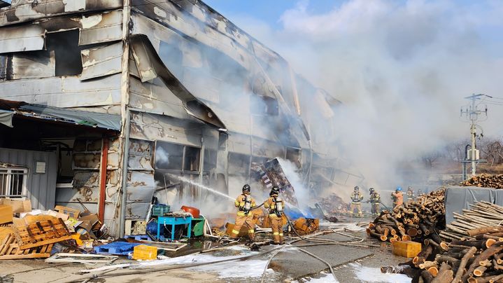 [제천=뉴시스] 이병찬 기자 = 11일 오후 1시께 충북 제천시 송학면 약초창고에서 불이나 1057㎡ 규모 조립식 건물과 보관 중인 약초 등을 모두 태우고 4시간여 만에 진화됐다.