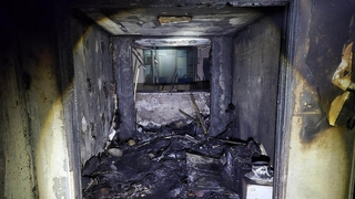 집 안 전체가 검게 타버렸고, 남은 가재도구와 뜯겨나간 벽지는 바닥에 어지럽게 흩어져 있습니다.