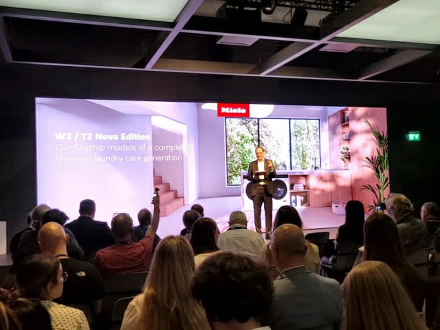 개막에 앞서 4일 오전 11시(현지시각) 진행된 미디어 컨퍼런스에서 밀레의 공동 회장인 라인하르트 진칸 회장은 진공청소기 ‘가드’ 시리즈를 소개했다. 이어 마르쿠스 밀레 회장은 W2/T2 노바 에디션 세탁기·의류건조기를 선보였다.