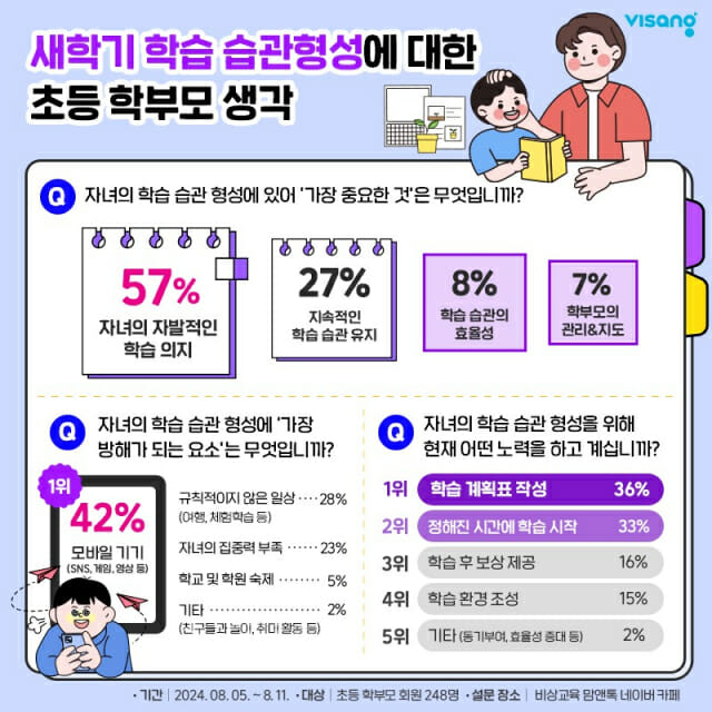 글로벌 에듀테크 기업 비상교육(대표 양태회)이 지난 8월 5일부터 일주일간 초등 학부모 교육정보 커뮤니티 ‘맘앤톡’을 통해 초등 학부모 248명을 대상으로 ‘초등 자녀의 학습 습관 형성’에 대한 설문조사를 실시한 결과를 4일 공개했다.