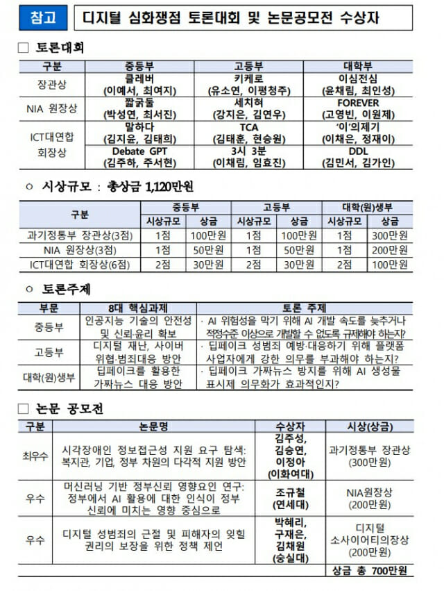 디지털 심화쟁점 토론대회는 8월 서면심사, 9월 온라인 토론대결, 10월 12일 4강전을 통해 선발된 우수한 중학생, 고등학생, 대학생이 참여한 가운데 인공지능 혁신과 규제 조화, 딥페이크 성범죄와 가짜뉴스 대응 등 디지털 심화시대의 핵심 쟁점에 대한 활발한 토론이 이뤄졌다.