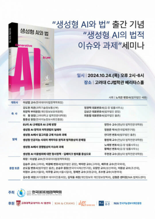 데이터 활용과 보호를 위한 법정책 연구를 지향하는 한국데이터법정책학회(회장 이성엽 고려대 교수)는 오는 24일 오후 2시부터 고려대 CJ법학관 베리타스홀에서 ‘생성형 AI와 법’ 출간 기념을 겸한 2024년 하반기 정기세미나를 ‘생성형 AI의 법적 이슈와 과제’를 주제로 개최한다고 밝혔다.