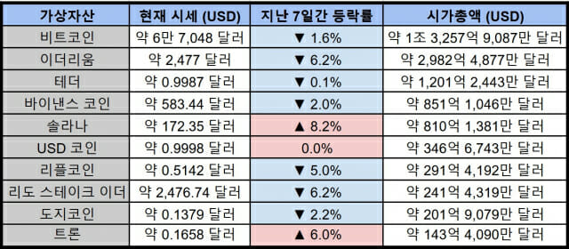 지난 7일간 비트코인과 이더리움은 각각 1.6%, 6.2% 하락하며 일부 조정을 겪었다. 비트코인의 현재 시세는 약 6만 7천48달러로 최근 이어온 상승세를 멈추고 소폭 하락세로 돌아섰다.