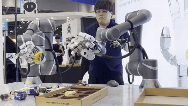 테솔로는 로봇핸드 ‘DG-5F’와 이를 데이터 글러브, 트래커와 결합해 사람의 움직임을 동일하게 수행하는 모습을 시연했다.