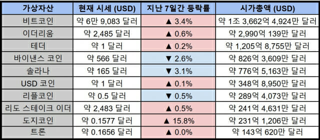 11월 3일 글로벌 가상자산 데이터 플랫폼 코인게코 기준 시가총액 상위 10개 가상자산의 시세는 다음 표와 같다.