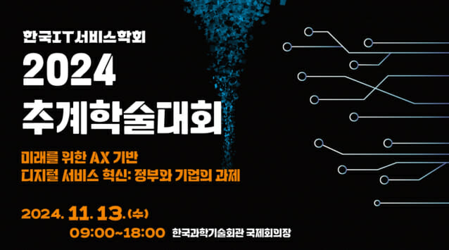 한국IT서비스학회(회장 이정훈 연세대 정보대학원 교수)는 13일 한국과학기술회관에서 ‘미래를 위한 AX(AI Transformation) 기반 디지털 서비스 혁신: 정부와 기업의 과제’를 주제로 ‘2024 추계학술대회’를 개최한다. 한국지능정보사회진흥원 공동주최로 진행하는 이번 학술대회는 한국지방행정연구원, 한국데이터산업진흥원, 한국수자원공사 등 주요 정부기관과 KT, 네이버, 로앤컴퍼니, 롯데멤버스, 영림원소프트랩, 카카오, 한글과컴퓨터 등 국내 유수의 ICT 기업들이 후원한다.