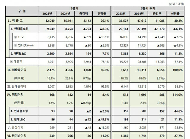 현대홈쇼핑 관계자는 “패션·주방용품·식품 상품군의 판매 호조로 매출은 소폭 늘었지만, 영업이익은 송출수수료 증가 등의 영향으로 감소했다”며 “연결 실적은 한섬과 현대퓨처넷이 회계 기준상 올해부터 종속회사로 신규 편입된 영향으로 전년 동기 대비 매출과 영업이익이 증가했다”고 말했다.