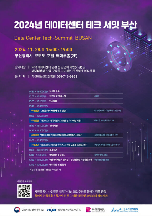 이번 ‘2024 데이터센터 테크 서밋 부산’은 부산정보산업진흥원이 친환경 그린 등 데이터센터 사업 7월 공모 유치를 통해 정보통신산업진흥원(NIPA)과 부산광역시가 주최하는 지역 데이터센터 집적단지 활성화 사업 일환으로 진행하는 행사다.