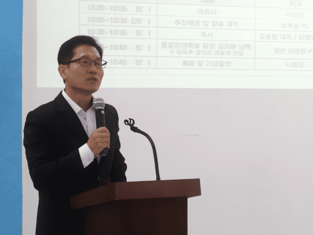 김동헌 대표를 비롯해 임직원 모두가 참석한 가운데 ‘품질경영목표 달성 결의문’을 선언하고 국제 수준 제품관리 역량으로 강화해 나아가겠다고 다짐했다.