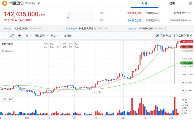 업비트 기준 비트코인은 전일대비 약 2.25% 상승한 약 1억4천200만원 선에서 거래되고 있다.