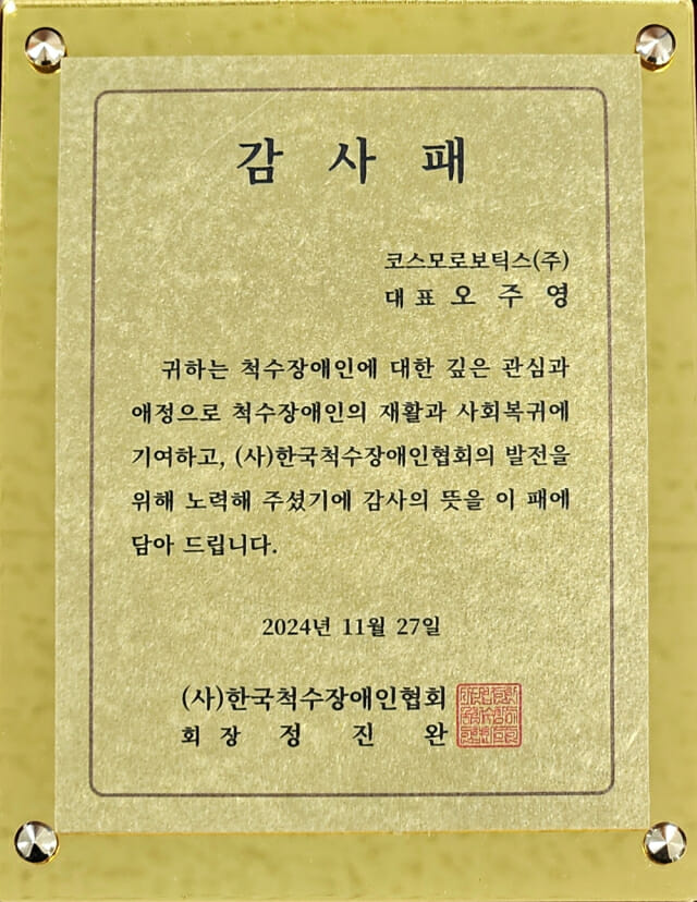 오 대표는 수상 소감에서 “감사패는 코스모로보틱스와 KSCIA가 척수장애인 자립과 삶의 질 향상을 위해 공유하는 비전을 상징한다”며 “재활 로봇 기술의 발전을 선도하고 도움이 필요한 분들의 삶에 실질적인 변화를 만들어내기 위해 협력을 지속할 것”이라고 밝혔다.