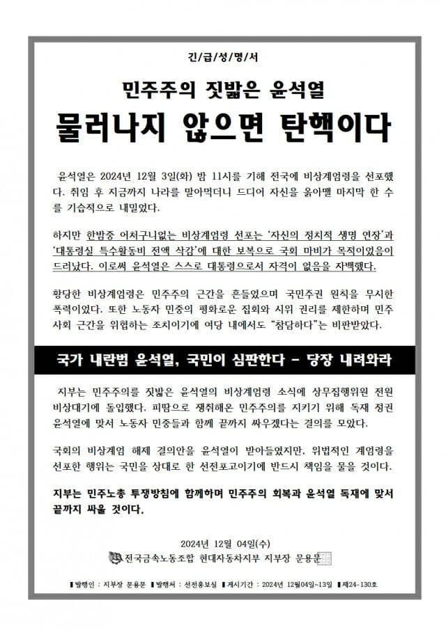 지난 3일 비상계엄 선포 이후 전국금속노동조합이 윤석열 정권 퇴진을 요구하며 부분 파업 방침을 결정하자, 금속노조 산하 현대차와 기아, 한국GM 등 완성차 업계 노조도 파업에 참여키로 했다.