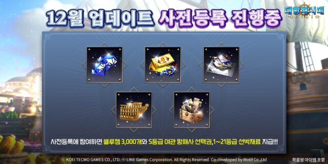 라인게임즈(공동대표 박성민, 조동현)는 모티프(대표 이인)와 코에이테크모게임스(대표 코이누마 히사시)가 공동 개발하고 자사가 서비스하는 오픈월드 MMORPG ‘대항해시대 오리진’에 진행 예정인 대규모 리뉴얼 업데이트에 앞서 사전 등록 이벤트를 진행한다고 6일 밝혔다.