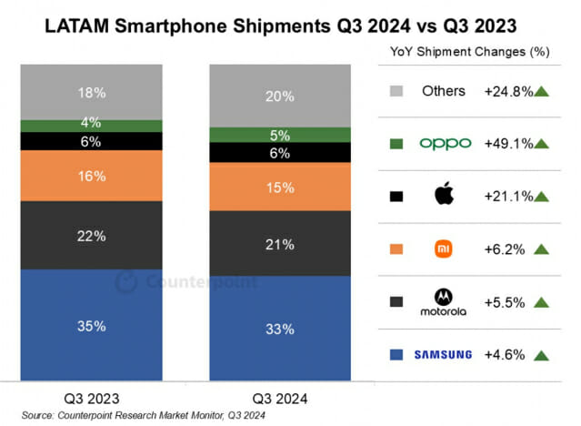 5일(현지시간) 시장조사업체 카운터포인트리서치에 따르면 올해 3분기 중남미 스마트폰 출하량은 전년 동기 대비 11.2% 증가하며 3분기 연속 두자릿수 성장을 기록했다.