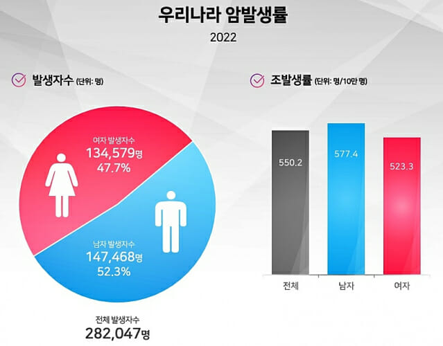 통계에 따르면 2022년 신규 발생한 암환자 수는 28만2천47명으로 직전 3년간 증가했으나, 2021년 대비해서는 154명(0.05%) 감소했다.