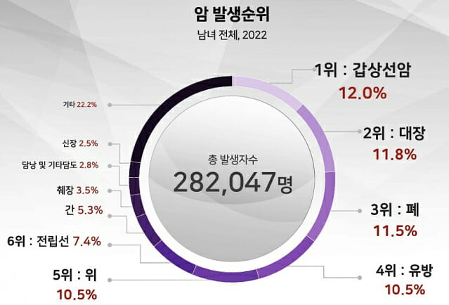 2022년 유병자 수가 가장 많은 암은 갑상선암(55만4천693명, 21.4%)이었으며, 이어서 위암(35만6천507명, 13.8%), 유방암(33만854명, 12.8%), 대장암(32만6천251명, 12.6%), 전립선암(14만7천618명, 5.7%), 폐암(131,496명, 5.1%) 순이었다.