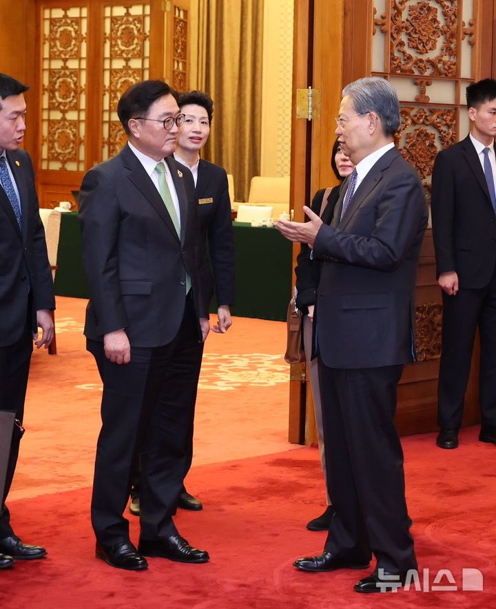 [베이징=뉴시스]박정규 특파원 = 중국을 방문한 우원식 국회의장이 5일 중국 내 서열 3위이자 국회의장격인 자오러지 전국인민대표대회(전인대) 상무위원장을 만나 한국의 정치상황이 불안정하지 않다는 점을 강조했다.