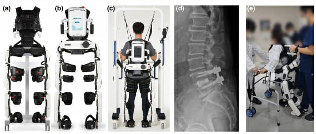 로봇 보조 보행 훈련 개념 설명 사진. (a) 보행 보조 훈련 로봇 전면 및 (b) 후면. (c) 로봇을 활용해 보행 보조 훈련 중인 환자 후면. (d) 측면 요추 방사선 사진과 (e)척추 보조기를 착용하고 보행 보조 로봇 훈련을 받는 환자 모습. (사진=강남세브란스병원)