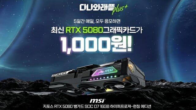 다나와는 10일부터 14일까지 5일 연속으로 래플 게시판에서 결제한 응모자를 대상으로 추첨을 통해 1명에게 지포스 RTX 5080 그래픽카드를 1천원에 판매 예정이다.