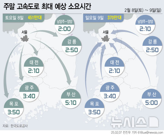 일요일 수도권 방향으로는 ▲대전-서울 2시간10분 ▲부산 대동-서울 5시간 ▲광주-서울 3시간40분 ▲목포-서서울 3시간50분 ▲강릉-서울 2시간50분 ▲양양-남양주 2시간10분이 소요될 전망이다.
