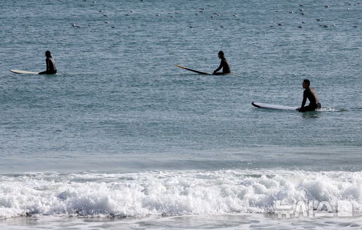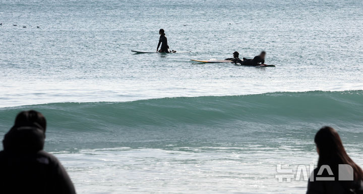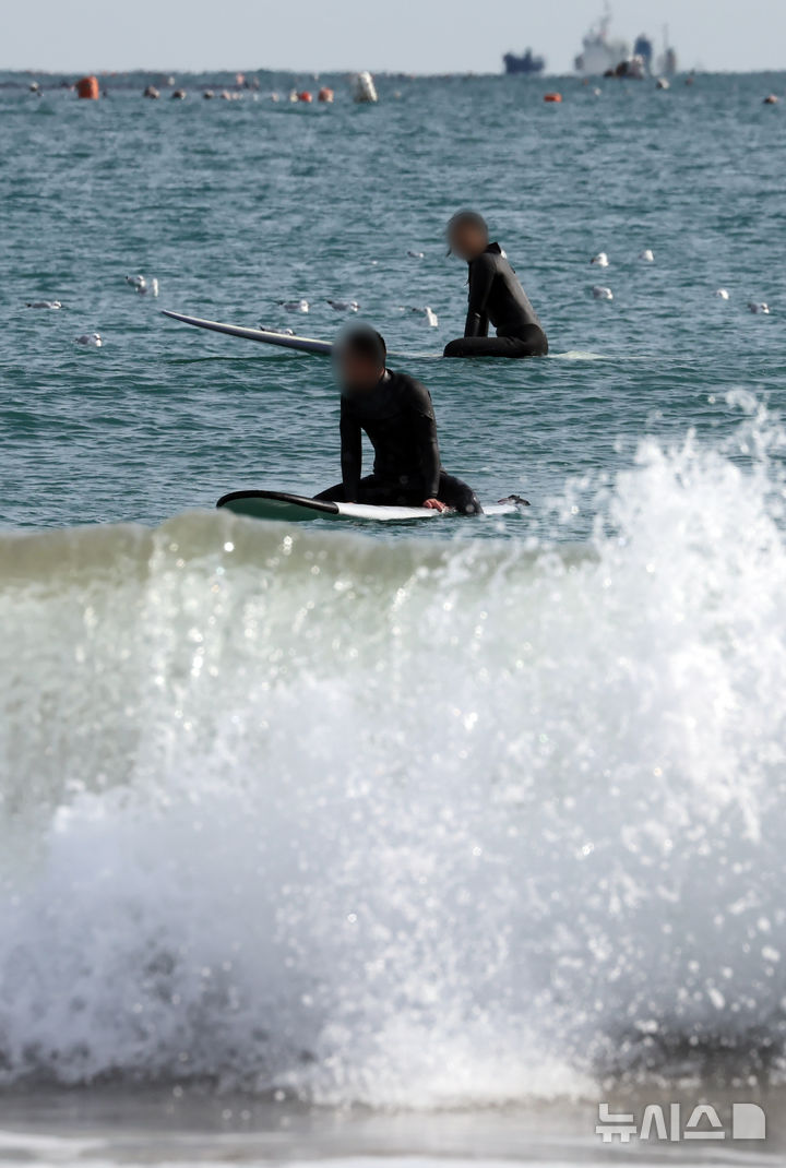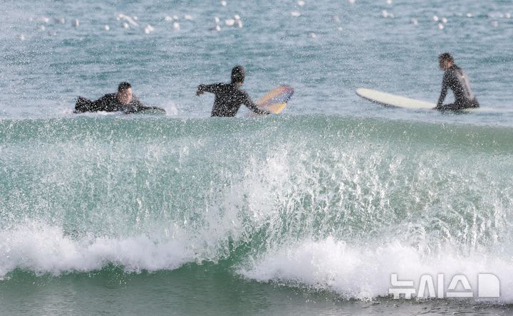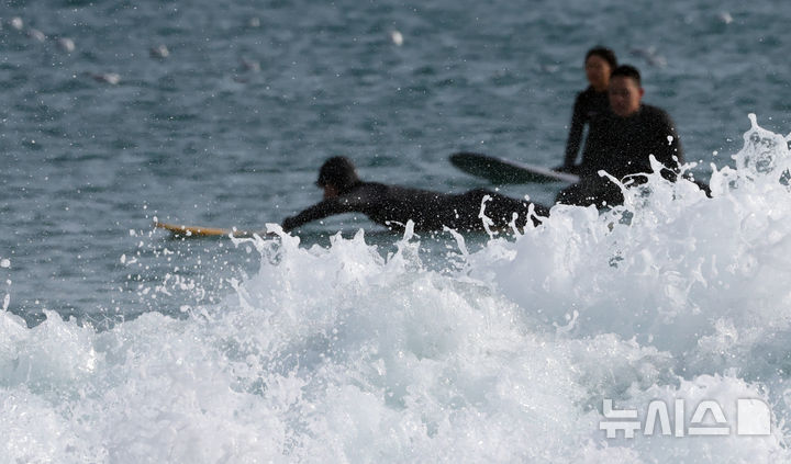 [서울·부산=뉴시스] 하경민 류현주 기자 = 전국에 한파가 덮친 6일 부산 해운대구 송정해수욕장을 찾은 서퍼들이 높은 파도를 즐기고 있다.