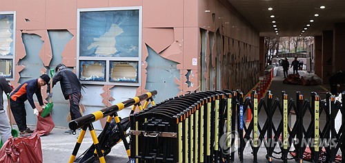 (서울=연합뉴스) 이진욱 기자 = 윤석열 대통령이 내란 우두머리 혐의로 구속되자 일부 윤 대통령 지지자들이 서울서부지방법원 내부로 난입해 불법폭력사태를 일으킨 19일 오후 서부지법에서 청사 관계자들이 파손된 시설물과 물품 등을 치운 뒤 복구작업을 하고 있다. 2025.1.19 cityboy@yna.co.kr연합뉴스TV 기사문의 및 제보 : 카톡/라인 jebo23