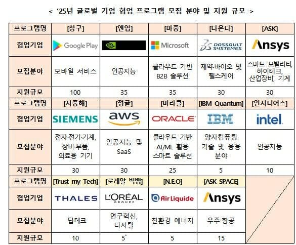 ▲창구(구글플레이·모바일 서비스) ▲엔업(엔비디아·인공지능) ▲마중(마이크로소프트·기업 클라우드) ▲다온다(다쏘시스템·건강관리) ▲ASK(앤시스코리아·미래자동차와 산업 장비) ▲지중해(지멘스·전자 및 의료 기기) ▲정글(아마존웹서비스·인공지능) ▲미라클(오라클·클라우드 기반 인공지능(AI)) ▲IBM 퀀텀(IBM·양자컴퓨팅) ▲인지니어스(인텔·인공지능) ▲내 기술 믿어(탈레스·심화 기술) ▲로레알 빅뱅(로레알코리아·디지털 연구) ▲N.E.O(에어리퀴드·친환경 에너지) ▲ASK 스페이스(앤시스코리아·우주항공) 14개 사업 가운데 1개에 신청하면 된다.