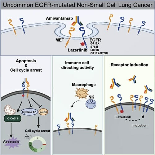 연구팀은 EGFR 변이 치료제의 내성을 일으키는 메커니즘인 MET 변이를 동시에 타깃하는 새로운 치료법을 시도했다. 3세대 EGFR 표적항암제 레이저티닙과 EGFR-MET 이중 표적 항체 아미반타맙을 병용해 기존 치료제의 한계를 극복할 수 있는 가능성을 확인했다.