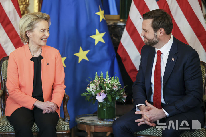 [서울=뉴시스] 최현호 기자 = 유럽연합(EU)과 미국 간 무역 전쟁이 본격화될 조짐을 보이는 가운데, 11일(현지 시간) 우르줄라 폰데어라이엔 EU 집행위원장과 JD 밴스 미국 부통령이 첫 회동을 가졌다.