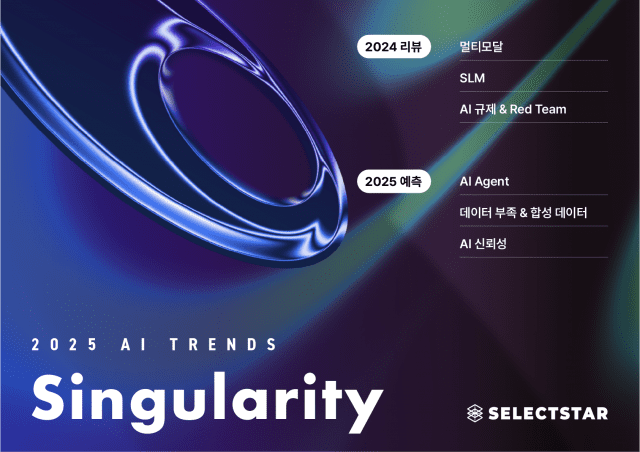 12일 셀렉트스타가 발간한 ‘2025 AI 트렌드 : 특이점’에 따르면 올해 AI 산업의 주요 키워드는 ‘AI 에이전트’, ‘합성 데이터’, ‘AI 신뢰성 강화’로 요약된다. 이번 보고서는 지난해 AI 시장의 주요 변화를 분석하고 기업과 연구자들에게 미래 AI 기술 발전 방향을 제시했다.