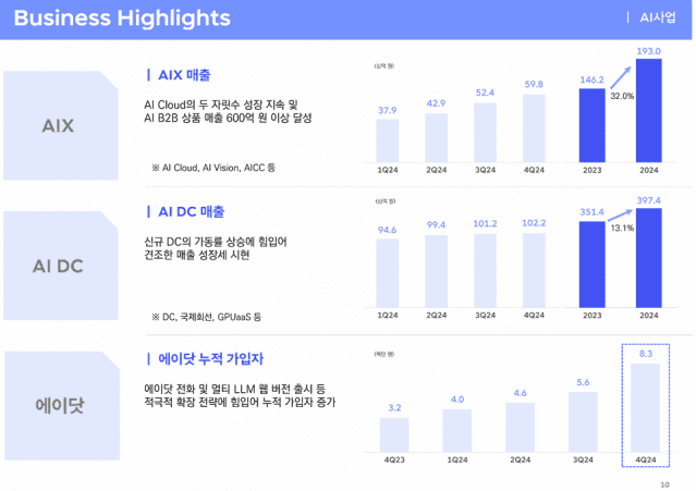 김양섭 SK텔레콤 CFO는 “AIX 사업부는 올해도 약 30% 성장할 것으로 기대하고 있다”며 “AI DC 사업부 매출은 시장 수요에 기반해서 지금보다 훨씬 큰 폭으로 성장할 수 있을 것이다. 올해 두자릿 수 성장할 것”이라고 말했다.