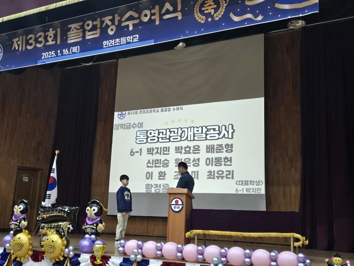 [통영=뉴시스] 신정철 기자 = 통영케이블카를 운영 중인 통영관광개발공사는 관내 초등학교 졸업식에 참석해 총 190만 원의 장학금과 장학증서를 전달했다고 14일 벍혔다.