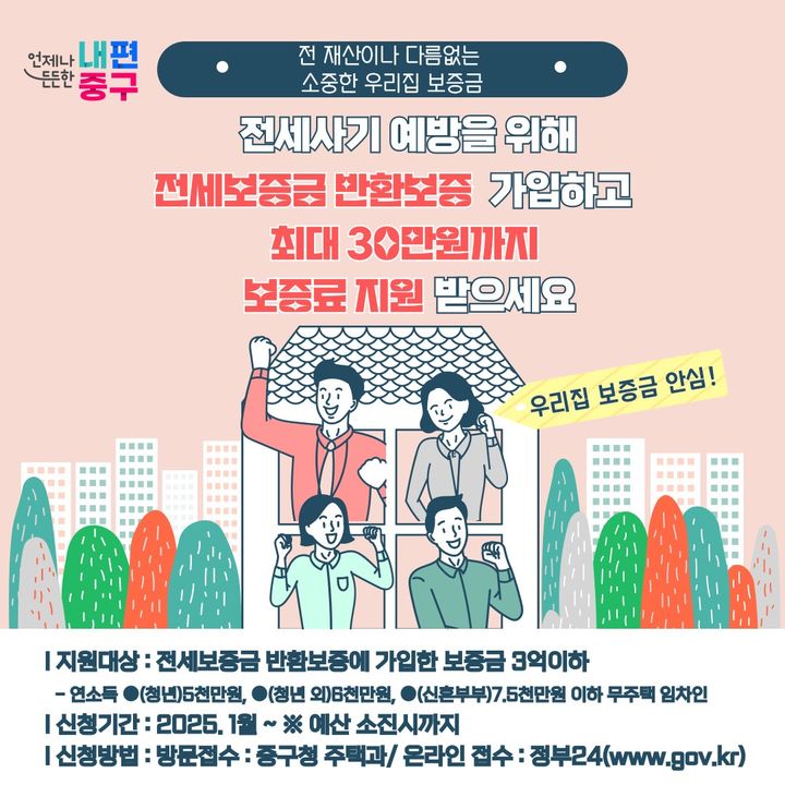 지원 대상은 중구에 거주하는 무주택 임차인으로, 전세보증금 3억 이하의 세입자다. 소득은 연간 ▲청년(19~39세) 5000만원 ▲청년 외 6000만원 ▲신혼부부 합산 7500만원 이하를 충족해야 한다.