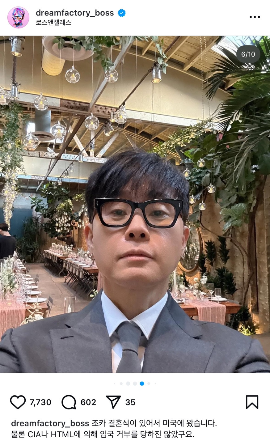 그는 자신의 SNS에 사진을 올리고 “조카 결혼식이 있어서 미국에 왔다. 물론 CIA나 HTML에 의해 입국 거부를 당하진 않았구요”라고 적은 뒤 조카의 행복을 기원했습니다