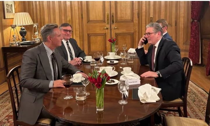 영국 주재 미국 대사관은 스타머 총리가 버넷 및 다른 사람들과 함께 저녁 식탁에 앉아 트럼프의 전화를 받는 장면의 사진을 트위터에 올렸다.