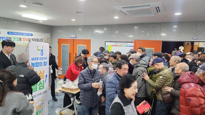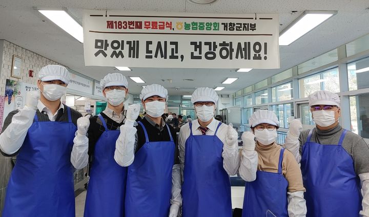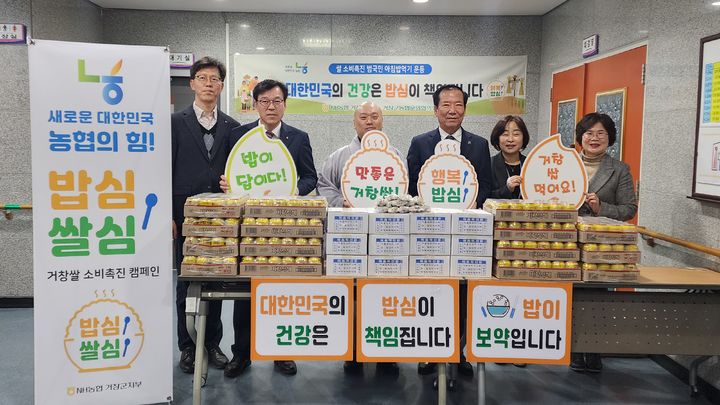 [거창=뉴시스] 서희원 기자 = 농협 경남 거창군지부(지부장 이희열)는 18일 거창군삶의쉼터(관장 선용) 실버대학 입학식을 맞아 거창 쌀 소비확대를 위한 홍보행사와 무료급식 지원 및 배식봉사를 실시했다.