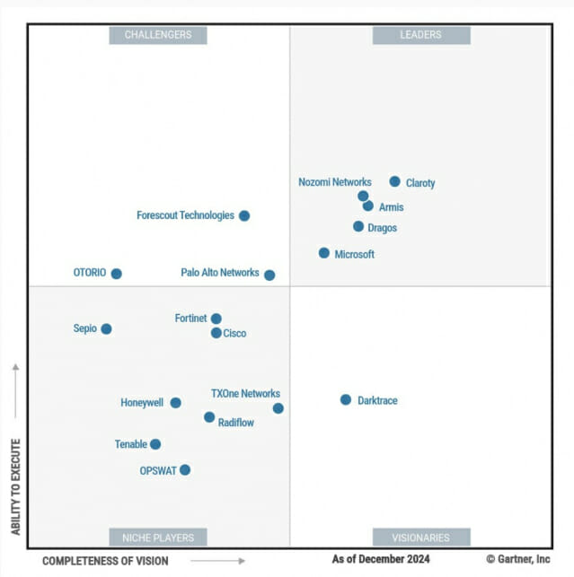 글로벌 사이버물리시스템(CPS) 보안 전문기업 클래로티(Claroty)는 가트너(Gartner)가 발표한 ‘매직 쿼드런트 CPS 보호 플랫폼 부문’에서 리더로 선정됐다고 22일 밝혔다. 클래로티는 이번 평가에서 17개 기업 중 실행 역량과 비전 완성도 부문에서 가장 높은 평가를 받았다고 설명했다. 클래로티 외에 마이크로소프트(MS) 등 5개 회사가 리더군에 자리했다.