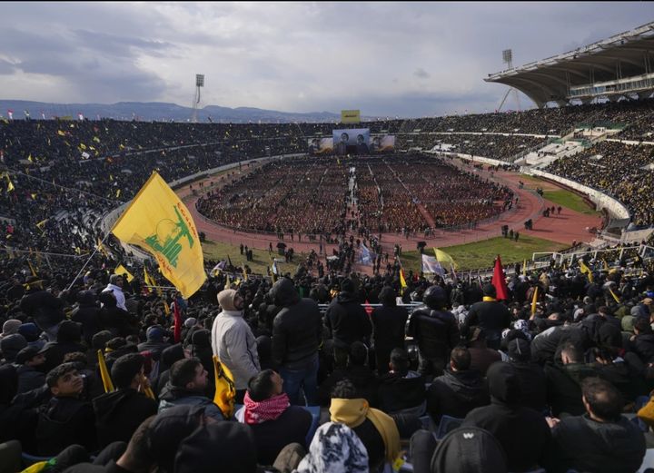 관중석에서는 수천 명의 헤즈볼라 지지자들이 단체의 노란 깃발을 흔들며 “미국에 죽음, 이스라엘에 죽음”을 외쳤다.