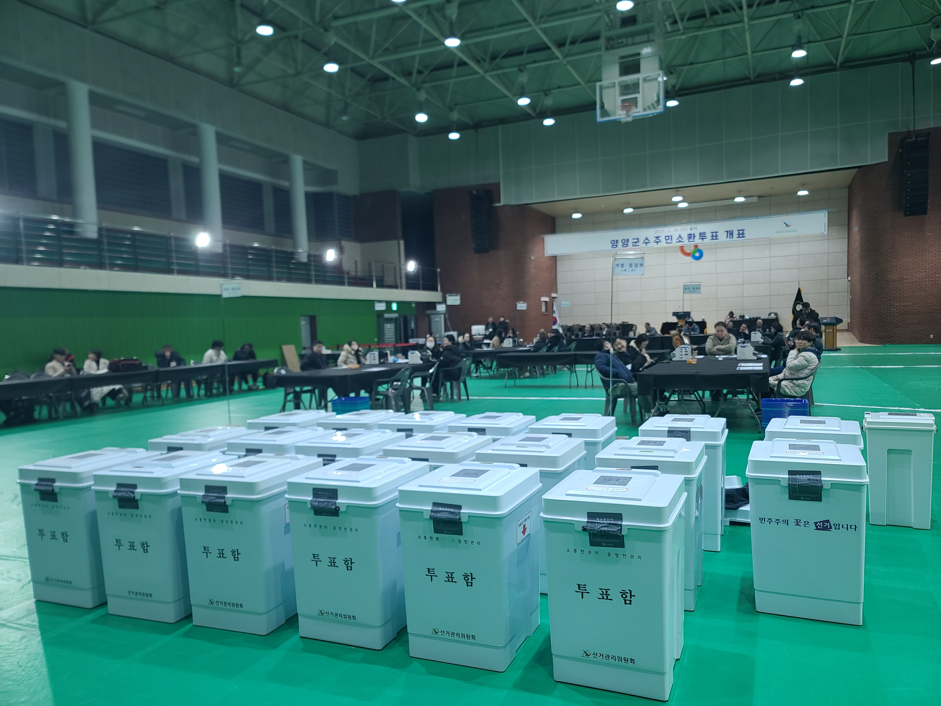 양양군선거관리위원회는 사전투표와 본투표 등을 합산한 최종 투표율이 32.25%에 그쳐 개표를 실시하지 않는다고 밝혔습니다.