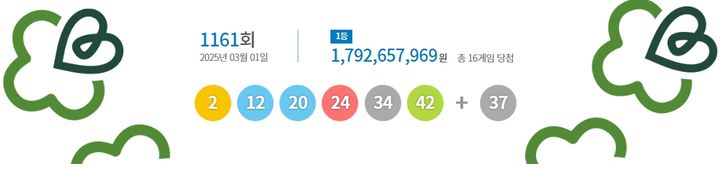[서울=뉴시스] 조성하 기자 = 1일 제 1161회 동행복권 로또 추첨 결과 ‘2, 12, 20, 24, 34, 42’이 1등 당첨 번호로 결정됐다. 2등 보너스 번호는 ’37’이다.