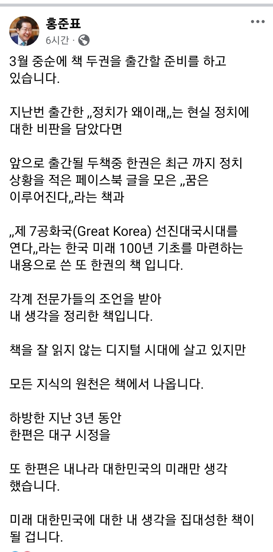 홍준표 대구시장은 오늘(4일) 자신의 페이스북을 통해 최근까지 정치 상황을 담은 페이스북 글과 미래 대한민국에 관한 생각을 담은 책 2권을 발간할 계획이라고 밝혔습니다.