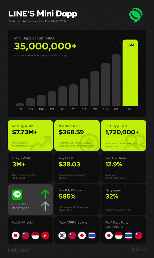 카이아 DLR 재단(재단)은 카이아 기반 미니 디앱 서비스가 라인 메신저 내 출시 한 달 만에 3천5백만명이 넘는 누적 이용자를 기록했다고 6일 밝혔다.