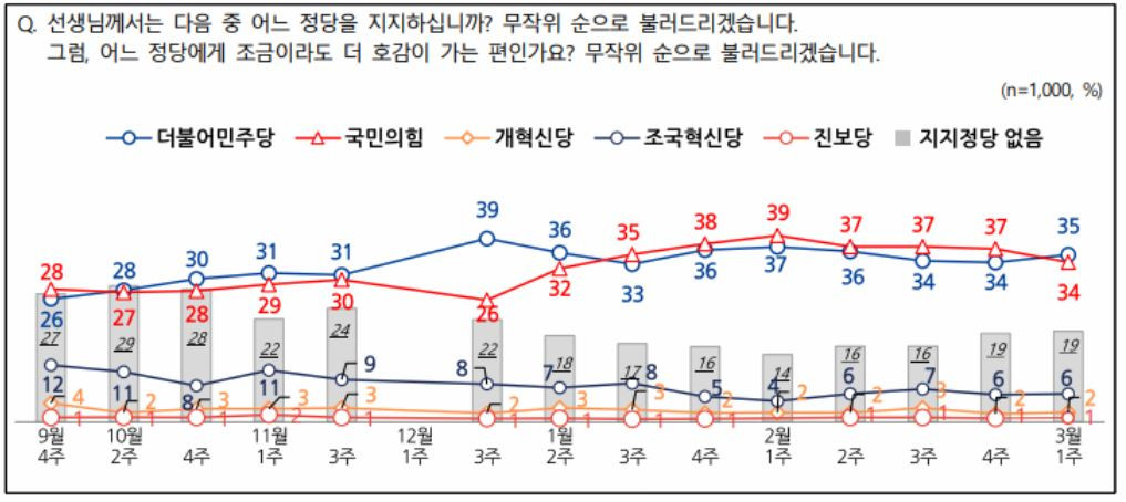 정당 지지도는 국민의힘이 지난주 조사보다 3%포인트 하락한 34%, 더불어민주당은 같은 기간 1%포인트 상승한 35%를 기록하며, 7주 만에 역전됐습니다.
