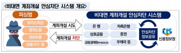 이 서비스는 수시입출식 계좌가 비대면으로 신규 개설되지 않도록 차단해준다. 은행뿐만 아니라 저축은행·상호금융·우정사업본부 등 3천613개사가 참여해 이 곳의 수시입출식 계좌의 비대면 개설이 이뤄지지 않는다.