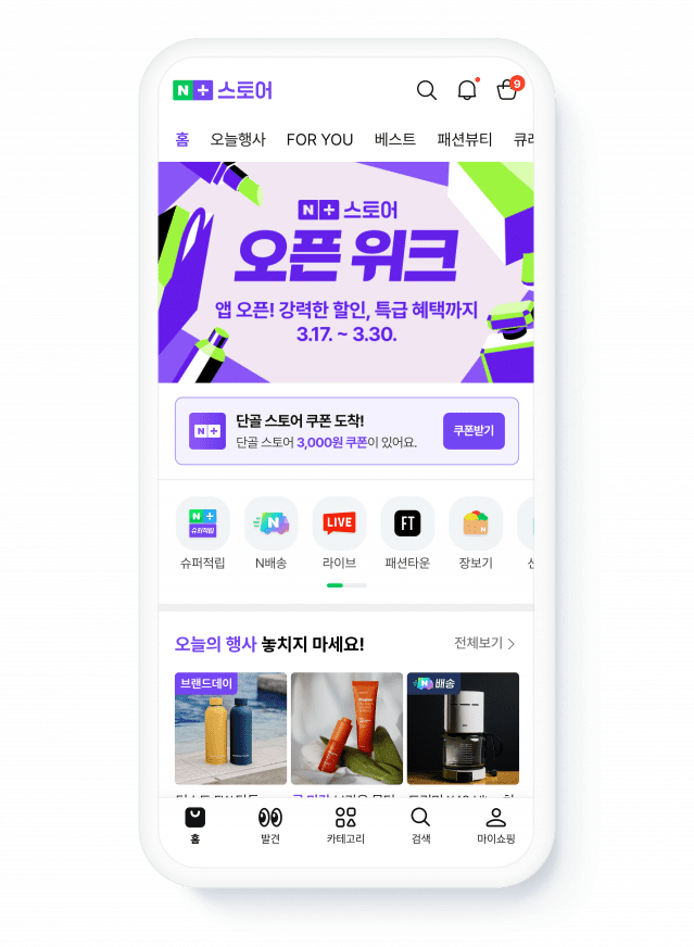 행사 기간 매일 오전 0시와 10시에 네이버플러스 스토어 앱 내에서 2만 원 이상 구매시 10% 할인 쿠폰(최대 3천 원), 5만 원 이상 구매시 15% 할인 쿠폰(최대 8천 원)을 선착순으로 제공한다.