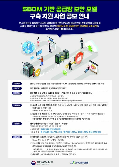 과학기술정보통신부(과기정통부)는 한국인터넷진흥원(KISA, 원장 이상중)과 함께 글로벌 규제 및 소프트웨어(SW) 공급망 위협에 대응하기 위해 국내기업들의 SW 공급망 보안 관리체계 구축 및 운영 전반에 대해 지원하는 ‘SBOM 기반 SW 공급망 보안모델 구축 지원사업’을 본격 추진한다고 밝혔다.