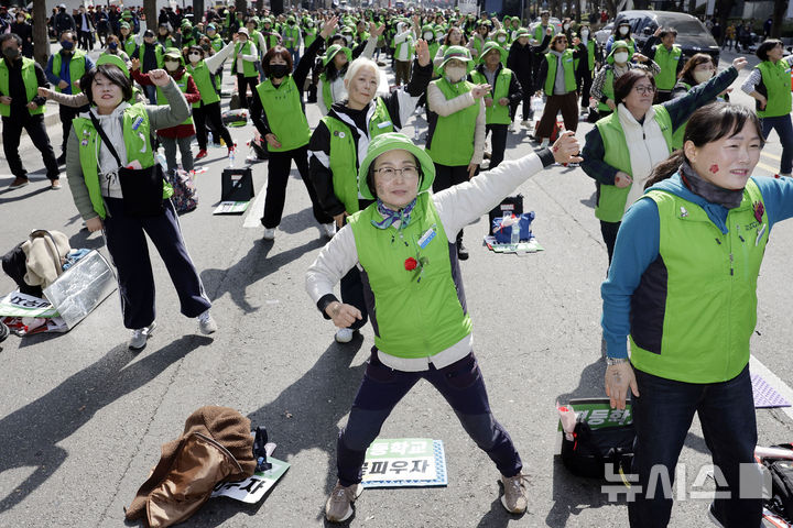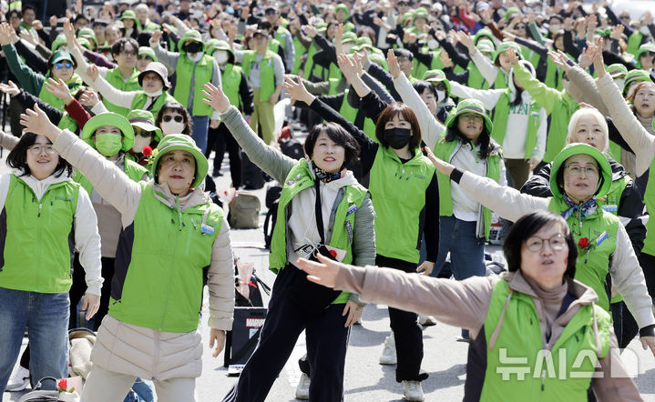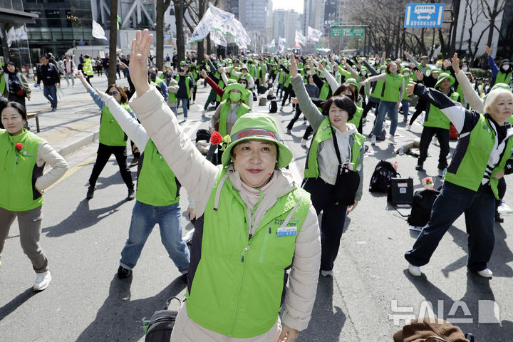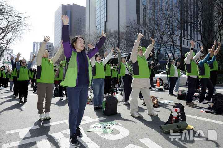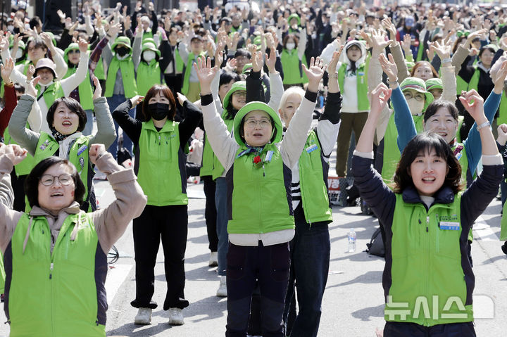 [서울=뉴시스]최동준 기자 = 민주노총 공공운수노조 전국교육공무직본부가 15일 서울 종각역 인근에서 결의대회를 열고 평등학교 염원을 표현하는 플래시몹을 하고 있다.
